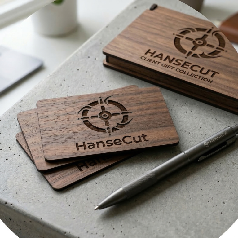 Heben Sie sich von der Masse ab. Wir fertigen beeindruckende Holz-Visitenkarten, gebrandete Mitarbeitergeschenke und exklusive Kundengeschenke. Präzise Logogravuren, die Ihre Marke haptisch und optisch perfekt in Szene setzen.